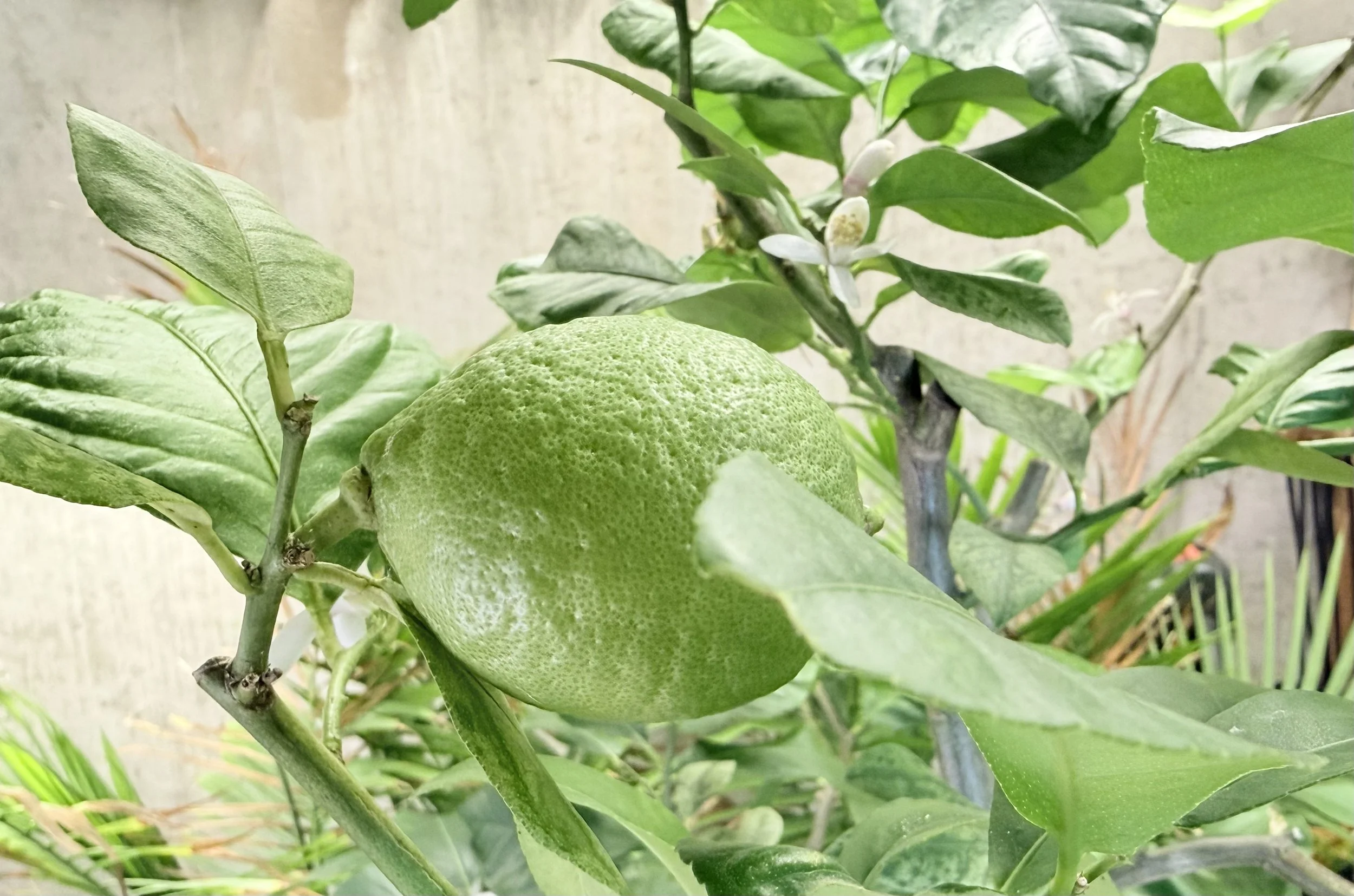 One full-sized lemon, likely set before the tree came in this fall, hangs beside heady blooms and some newly formed fruits—two seasons growing together. The tree has bloomed more freely under lights than it ever did outside by the swimming pool.